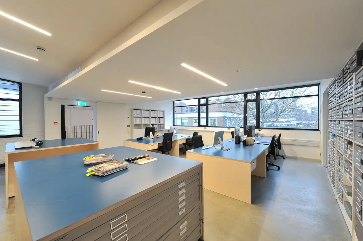 A team of furniture builders were commissioned to help me create a robust system for storage and access – bespoke double-depth units for rolling plan drawers. Bespoke desks were also created in the same timber finish, with the drawers gaining blue Formica tops drawn from the cool colour palette.